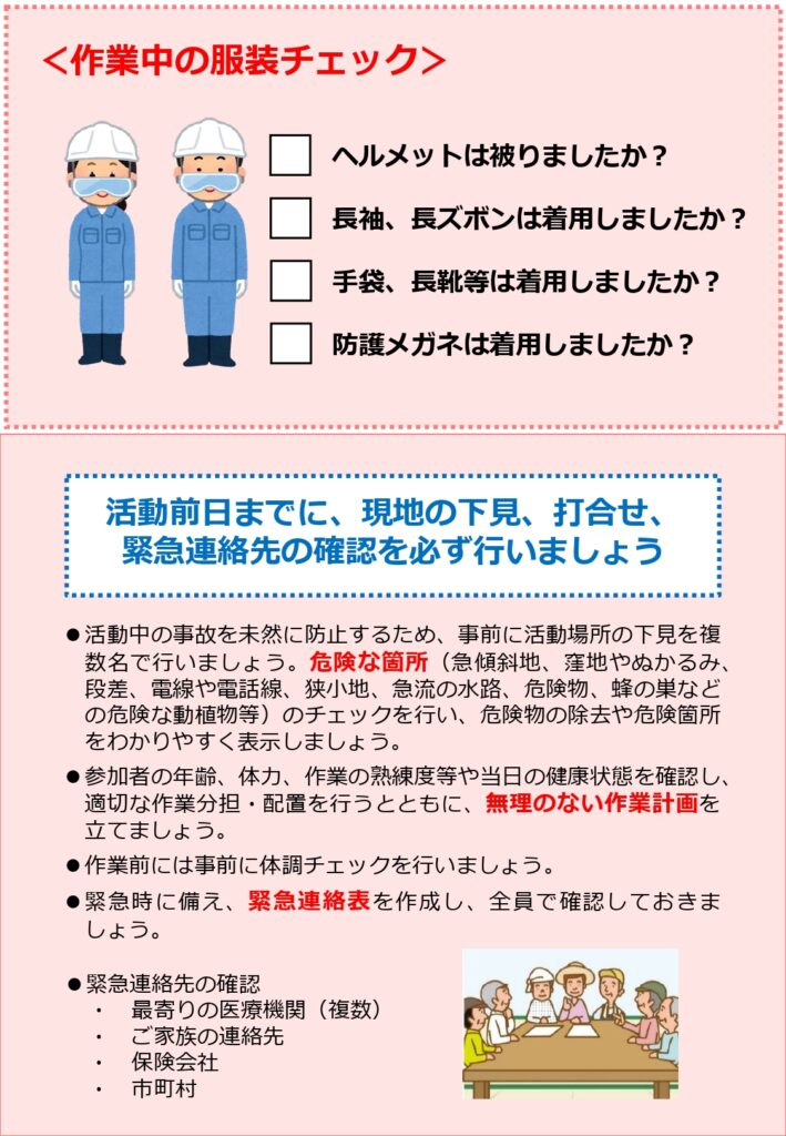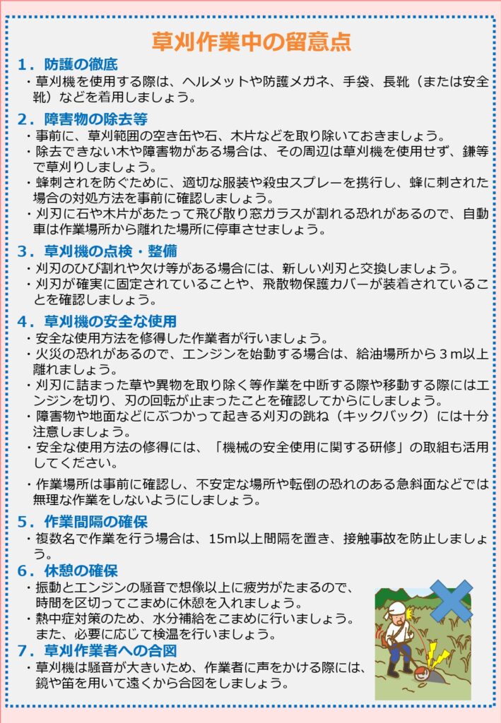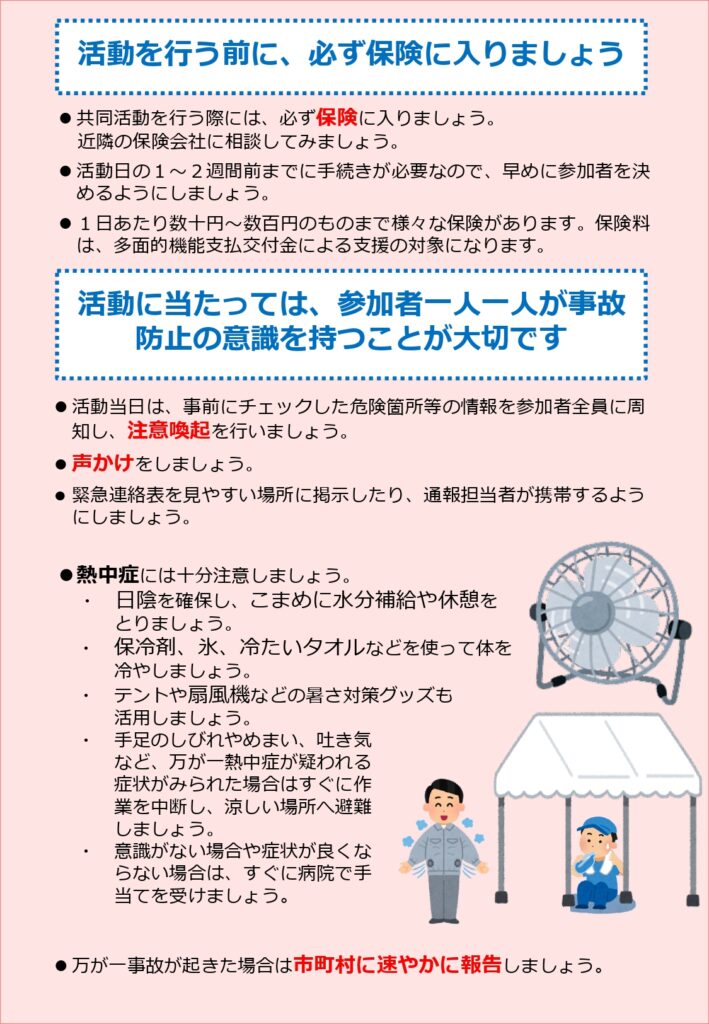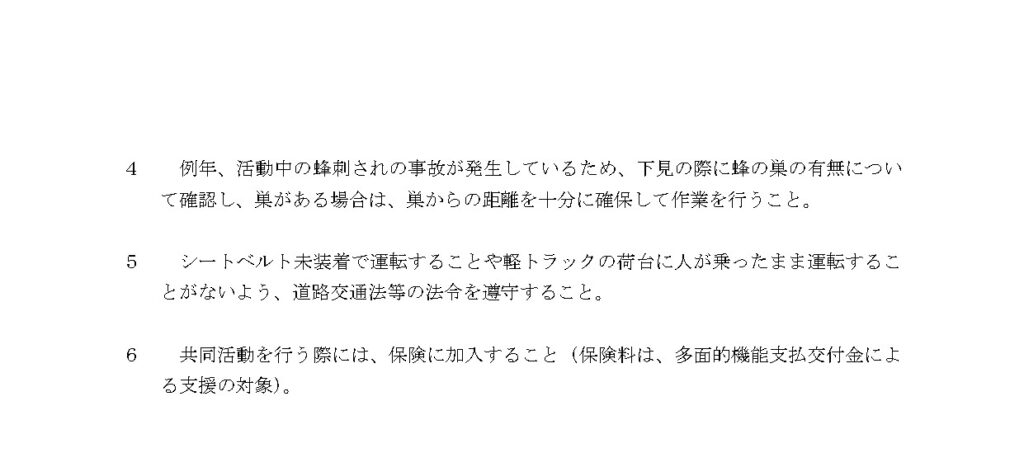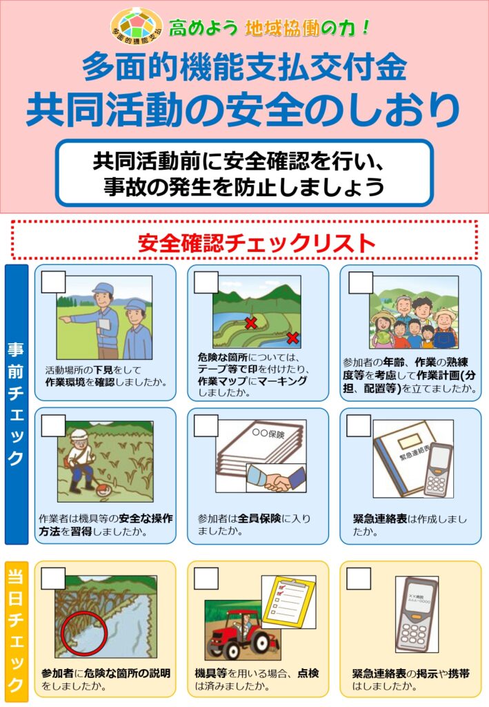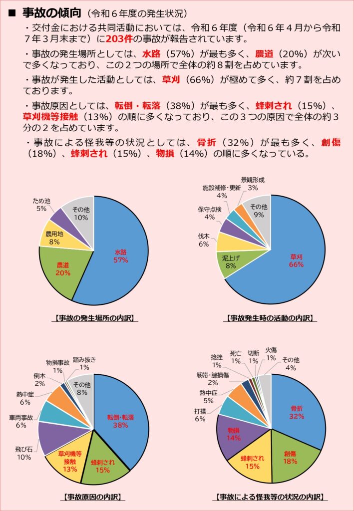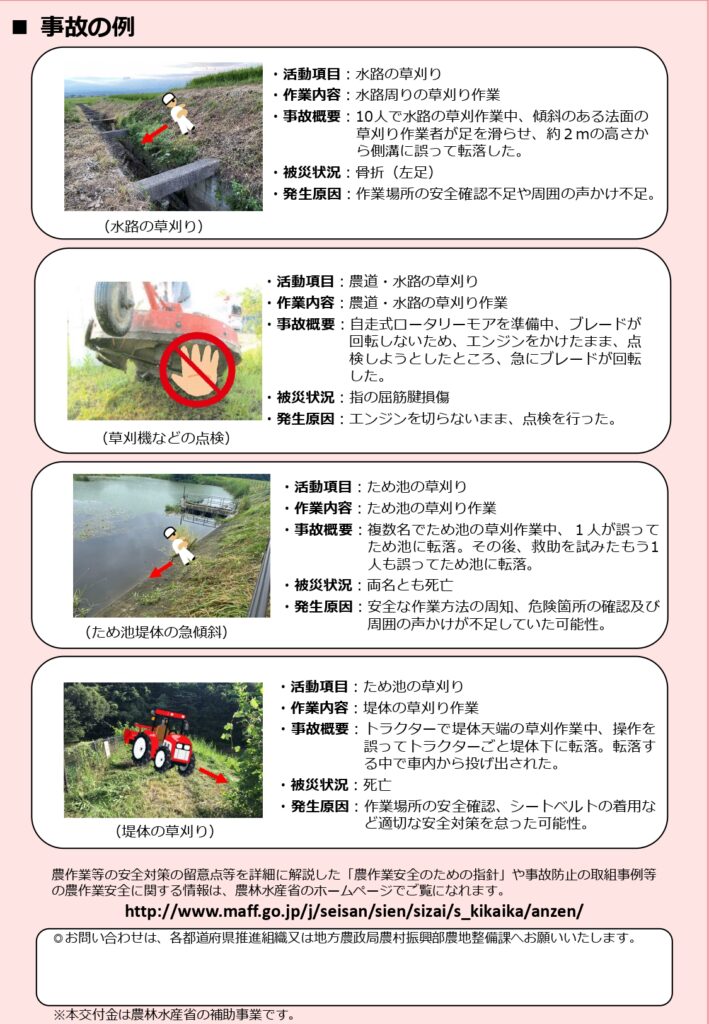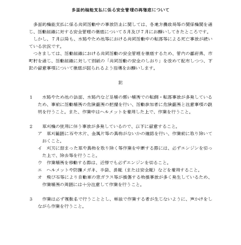 多面的機能支払に係る安全管理の再徹底について 2025年10月31日 今年度は、これまで九州管内で死亡事故が2件発生しており、全国でも7件発生しています。(昨年度は年度を通じて全国で2件) 再度、安全管理の徹底をお願いいたします。