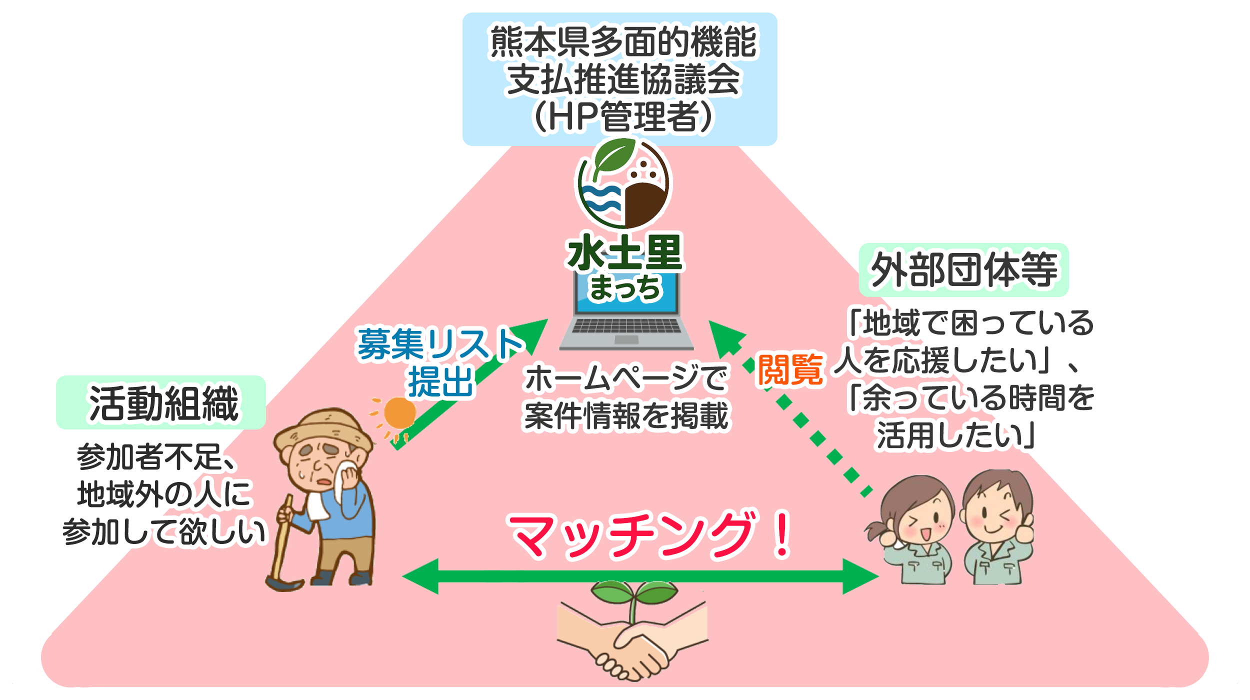 「水土里まっち」は、地域の農業・農村を支える多面的機能支払活動において、活動組織と外部団体・個人をつなぐマッチングサイトです。 活動組織が必要とする作業支援をホームページ上に掲載し、それを見た企業・大学生・個人などの外部参加者が応募することで、共同活動が実現します。
